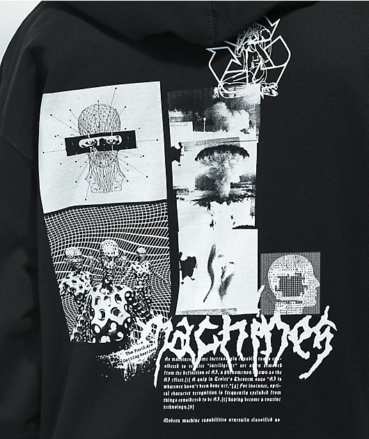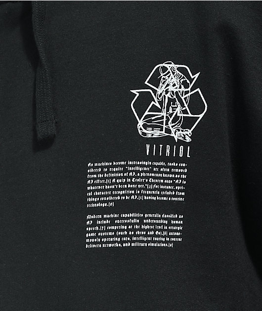 The Vitriol Machines black zip hoodie features screen-printing on the left chest and back of computer generated graphics and script inspired by artificial intelligence. This Vitriol hoodie features a full zip cotton blend construction, a brushed fleece in