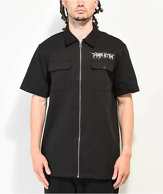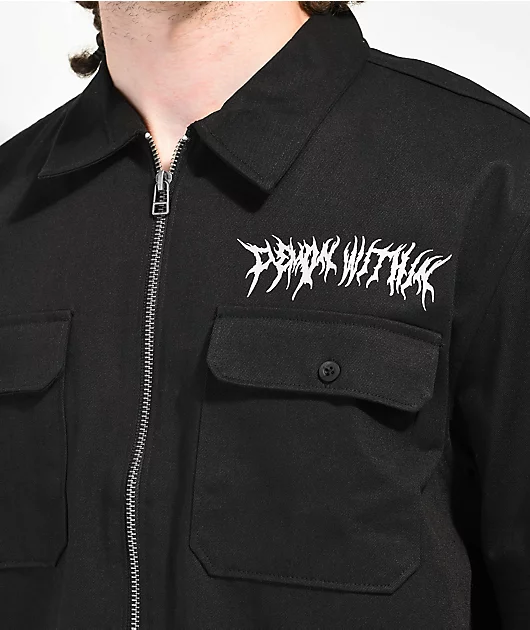 Vitriol introduces the Misery woven t-shirt in a black and white colorway. Left of chest is text reading, \”Demon within\” in white for contrast, while on the back is a graphic of a demonic horned skull with the same text below. This woven tee is constructe