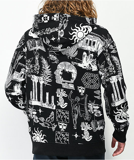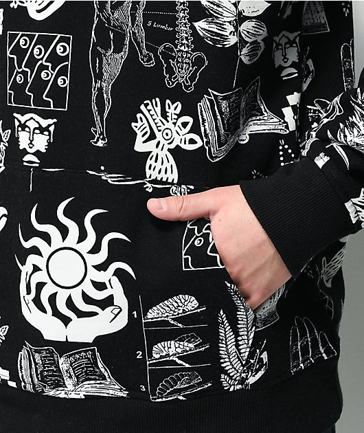 Add a dream state-infused fit to your hoodie rotation with the Mystical Michael black hoodie from Vitriol! This black pullover features a variety of white screen-printed graphics throughout such as a face made of circuits, suns with mysterious symbols, an