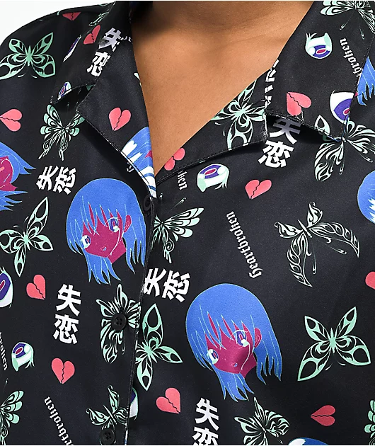 As comfortable as it is fashionable, the Ziggy Anime Print Vitriol button up shirt has a short sleeve, boxy silhouette, and a breathable, lightweight polyester construction. The black colorway is embellished with sublimated graphics throughout, like Engli
