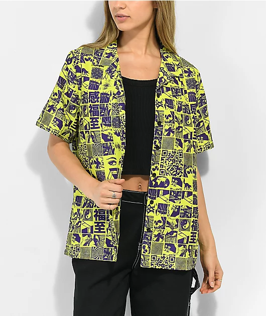 The Ziggy Woodblock button up shirt from Vitriol features a green colorway with purple woodblock printing throughout of images such as a scared cat, a person with their head in their hands, and a melting yin-yang symbol. This shirt has full button up clos
