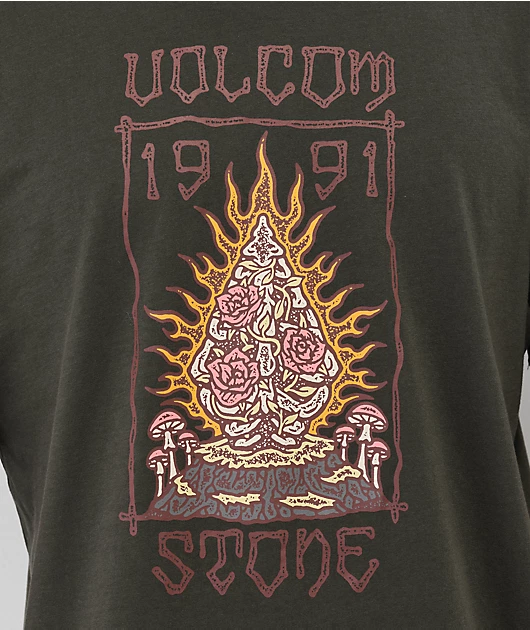 Made of 100% organic cotton, the Caged Stone t-shirt from Volcom comes in a grey colorway with a screen-printed front graphic of a flower-covered stone surrounded by a stick frame.