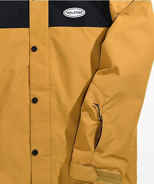 The kids Stone 91 snowboard jacket from Volcom is made of a 100% polyester shell and comes in a tan and black colorway with a white brand patch woven onto the left of chest. This snowboard jacket comes in a modern fit with easy pant-to-jacket interface an