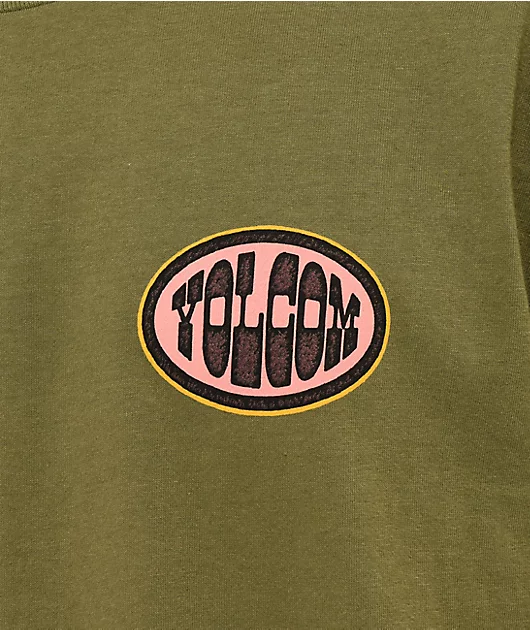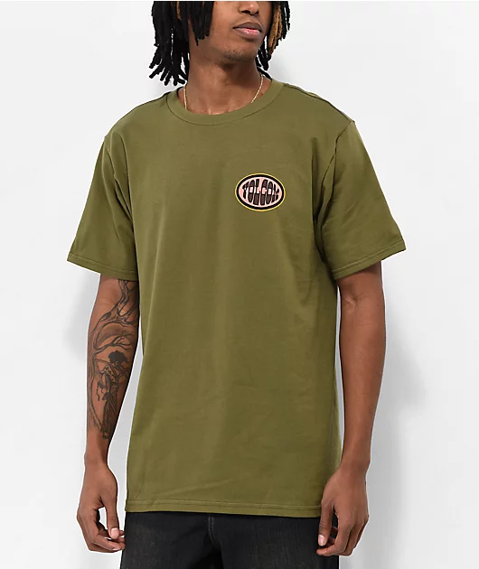 The Lapper t-shirt from Volcom is made of 100% cotton and comes in a green colorway, adorned with a peach brand logo on the left of chest and enlarged on the back.