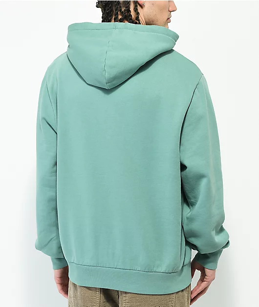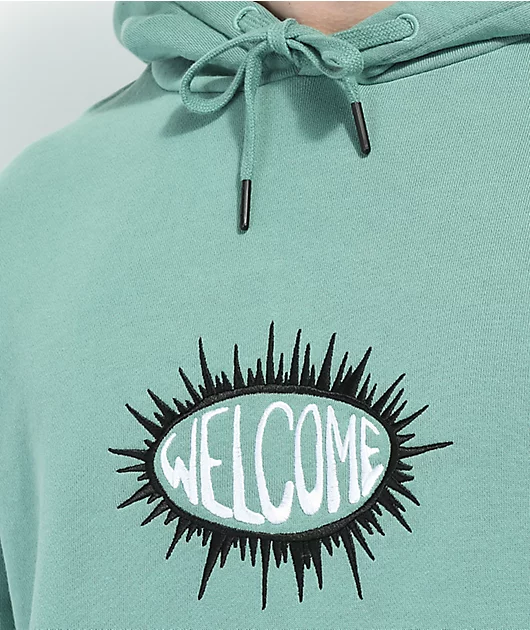 The Burst Welcome hoodie comes in a green colorway with an embroidered brand logo on the front with the brand name in white and sunrays around it in black. This hoodie is made of 100% cotton, and features a relaxed fit with a drawstring-adjustable hood an
