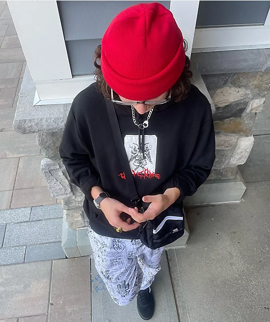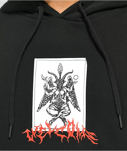 The Coagula Welcome hoodie features a black colorway with a screen-printed graphic on the front of Baphomet, an occult symbol of balance, with the brand name below in metal script. This hoodie has a classic pullover construction with a relaxed fit, drawst