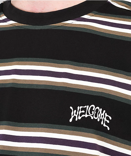 Welcome brings the Thelma stripe long sleeve t-shirt in a black colorway with horizontal striping in green, purple and white accents. On the left of chest is an embroidered brand name in white for contrast.