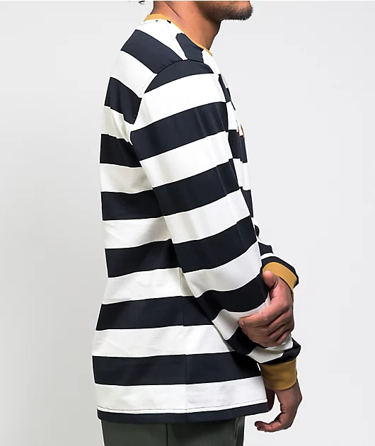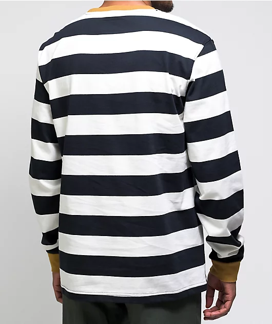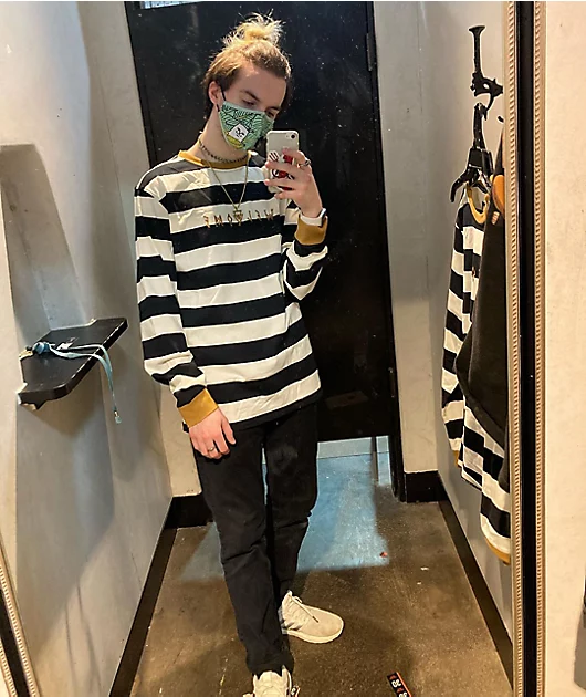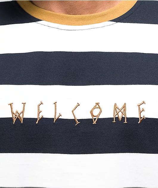 Splash some fun patterning into your wardrobe with the Welcome Thicc Stripe black and bone knit long sleeve t-shirt! Large, thick stripes of black and bone-white give this long sleeve a bold, eye-catching look. Gold Welcome script at the chest, along with