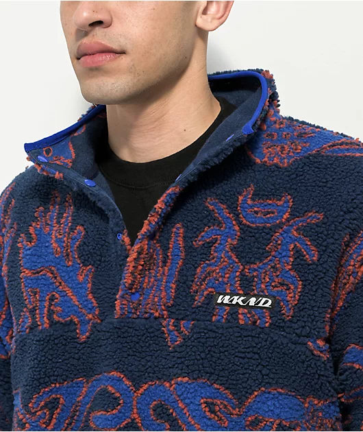 From WKND, the Temple jacket comes in a red and blue sherpa fleece construction with imagery inspired by tribal artwork. Made with a relaxed silhouette, the maximalist streetwear look features a quarter snap closure with a mock neck collar; as the fleece