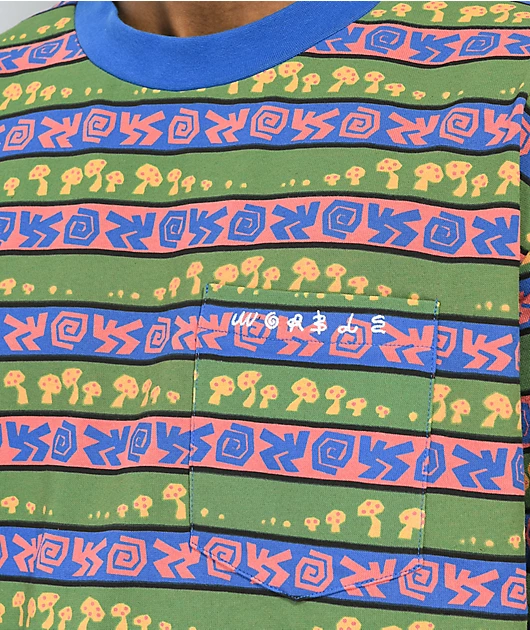 The Cure All WORBLE t-shirt features a navy collar and stripes adorned with images of mushrooms and spirals. This t-shirt, made of 100% cotton, has a patch pocket on the left side of the chest with the brand name embroidered into the pocket for added styl
