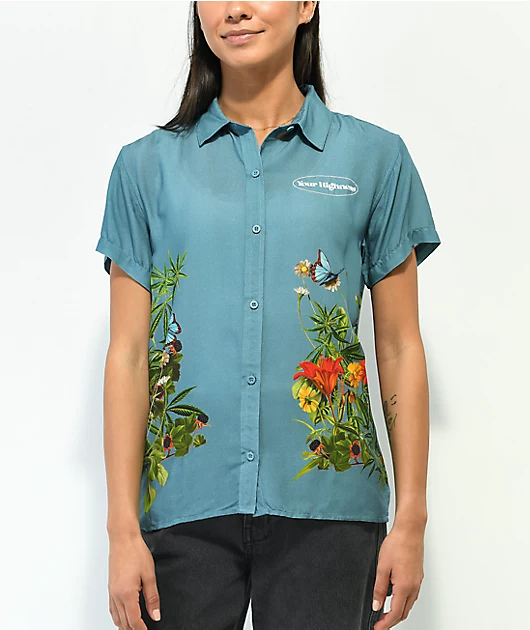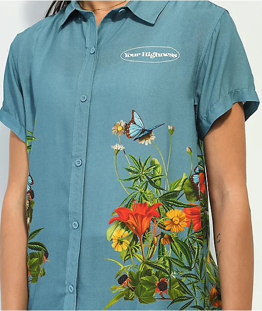 The Botanical Your Highness shirt is made with 100% rayon and comes in a full button-up construction with short sleeves. There is a sublimated graphic of the brand name on the left side of the chest as well as sublimated graphics throughout of floral and