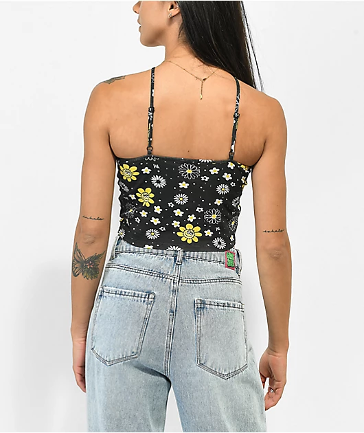 Made from a soft, stretchy blend of cotton-spandex, the Flower Shower Your Highness halter tank top will provide all-day comfort. Its black colorway is adorned with sublimated floral graphics throughout, with some of them having a dazed facial expression.