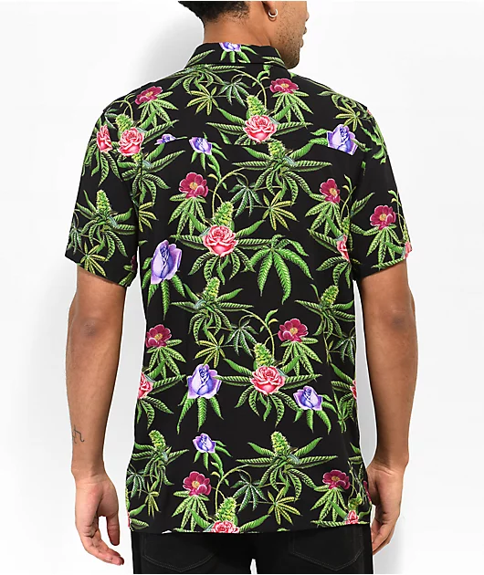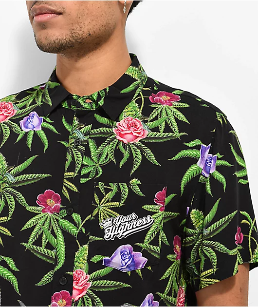 From Your Highness comes the Green Dream woven short sleeve button up shirt in a sleek black colorway, showing off the sublimated image of marijuana leaves with colorful roses throughout. On the left chest pocket of this cool shirt is the brand name scree