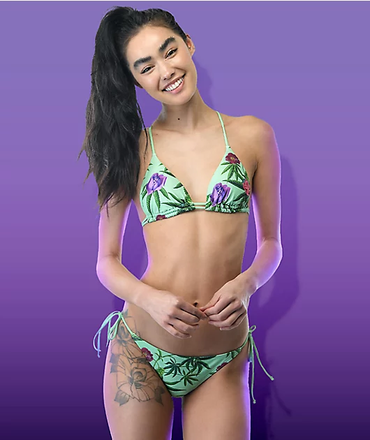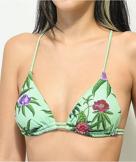 The Green Dream triangle bikini top from Your Highness comes in a light green colorway with sublimated imagery of marijuna buds and other flowers. This bikini top features moderate coverage and light support, and comes with padded cups and string ties for
