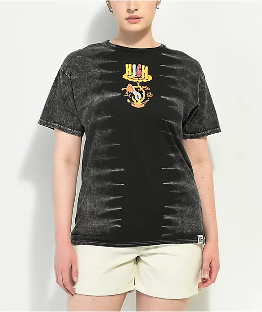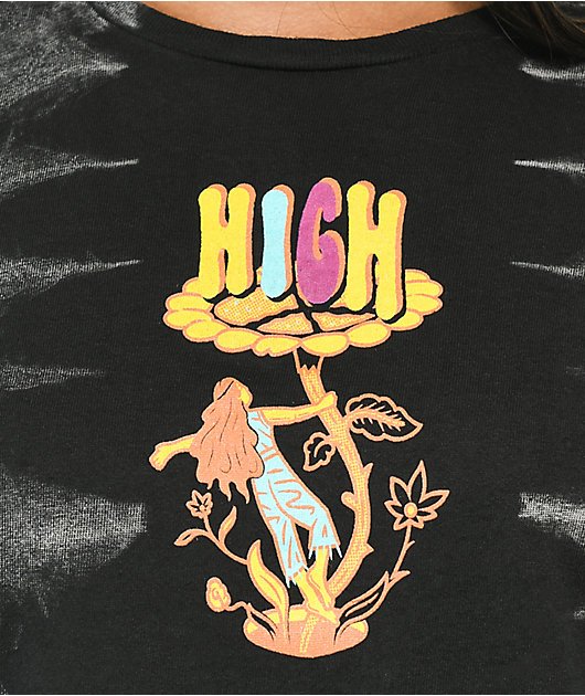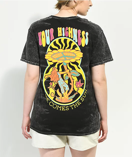 From Your Highness comes the Here Comes The Sun t-shirt with a unique black tie-dye wash treatment. The shirt features grey stacked patterning along the sides, while a vibrant orange and yellow flower graphic with multi colored \”High\” text is centered on