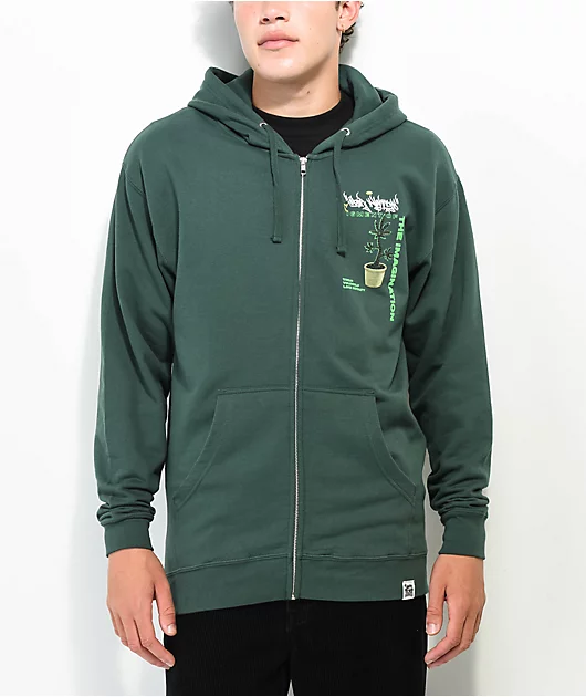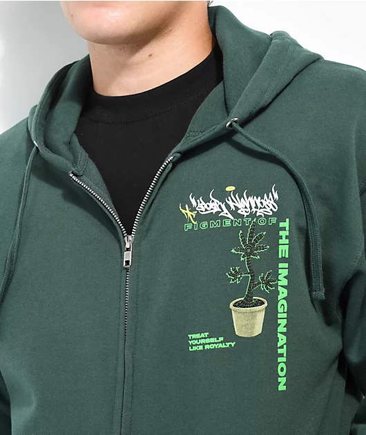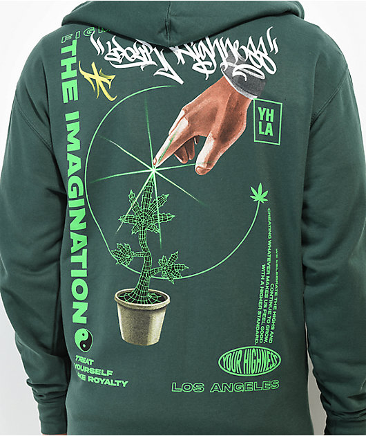 Your Highness Apparel introduces the Imagination zip hoodie in a dark green colorway. This full zip closure sweatshirt features a dual screen-printed graphic at the left chest and back of a digitized weed plant with script that reads \”figment of the imagi