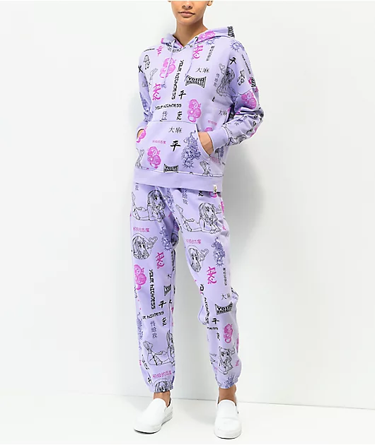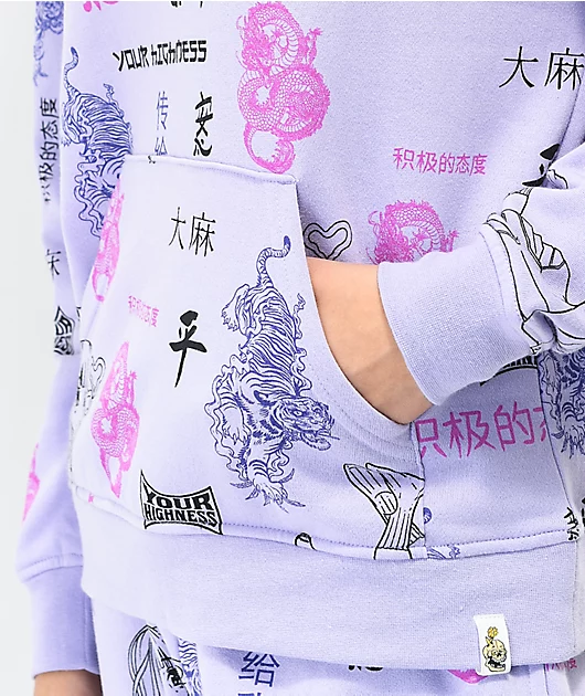 The Puff Puff AOP Broken Promises hoodie is constructed from soft cotton in a light purple colorway and comes decorated with screen-printed anime graphics, Japanese characters, and brand logos throughout. This hoodie has a classic pullover construction wi