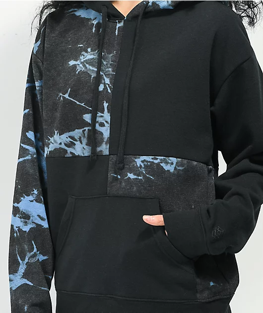 Add some mixed-up patterning into your life with the Zine Dani Patch black and blue tie dye hoodie! This hoodie features a unique patch design, with a black and blue tie-dye treatment taking up resident at the left side of the hood, the right shoulder and